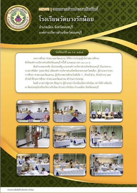 กองการศึกษา อบจ.นนทบุรี จัดประชุมผู้บริหารสถานศึกษาในสังกัด ครั้งที่๔/๒๕๖๕ ณ รร.วัดบางรักน้อย