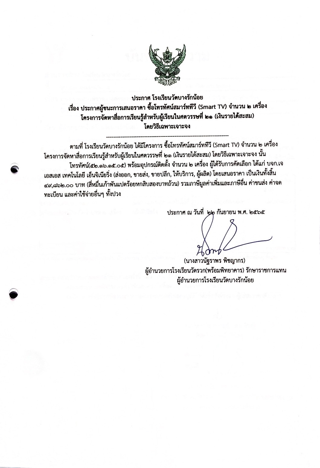 ประกาศผู้ชนะการเสนอราคา ซื้อโทรทัศน์สมาร์ททีวี (Smart TV) จำนวน ๒ เครื่อง โครงการจัดหาสื่อการเรียนรู้สำหรับผู้เรียนในศตวรรษที่ ๒๑(เงินรายได้สะสม) โดยวิธีเฉพาะเจาะจง