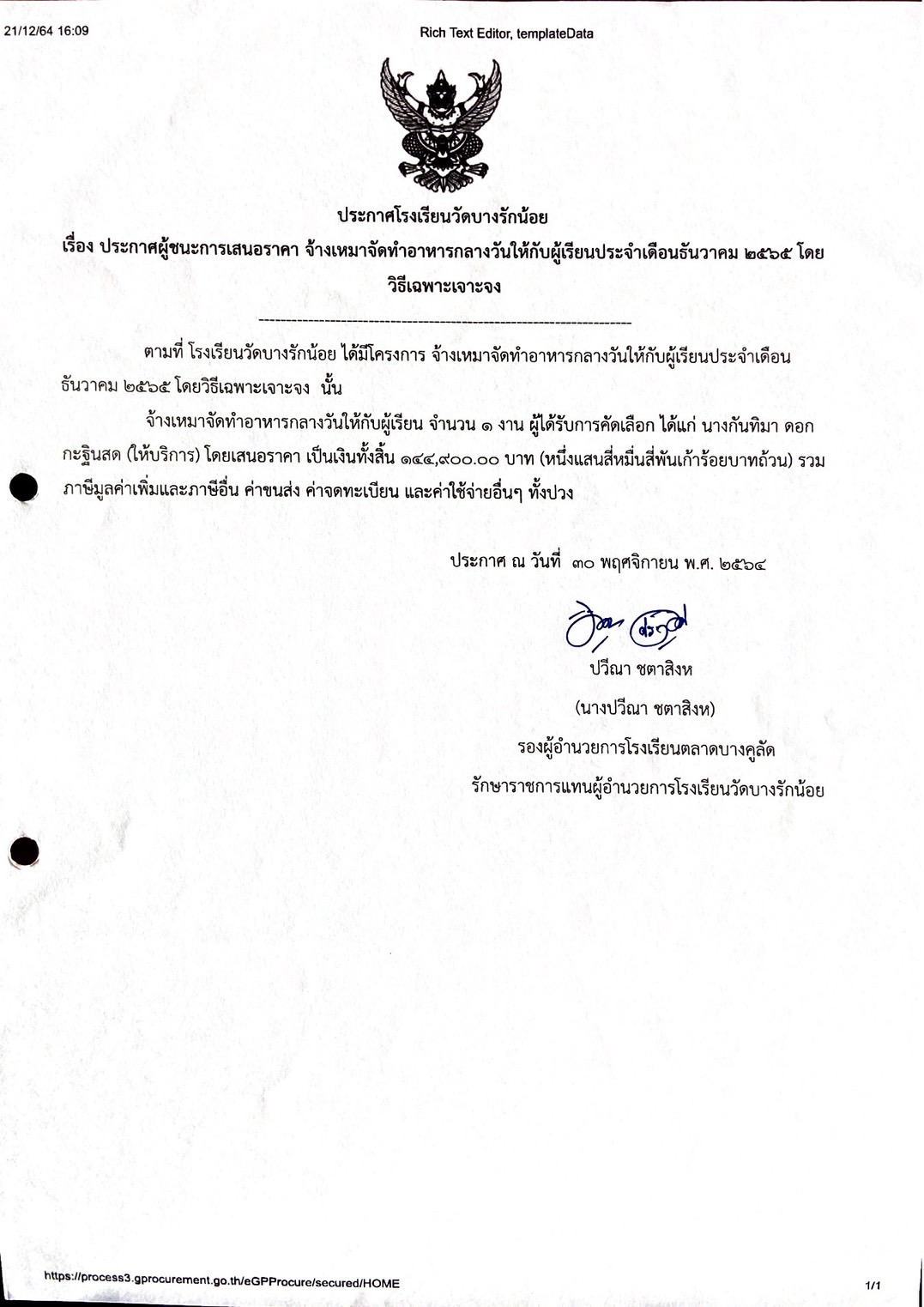 ประกาศผู้ชนะการเสนอราคา จ้างเหมาจัดทำอาหารกลางวันให้กับผู้เรียนประจำเดือนธันวาคม ๒๕๖๕ โดยวิธีเฉพาะเจาะจง
