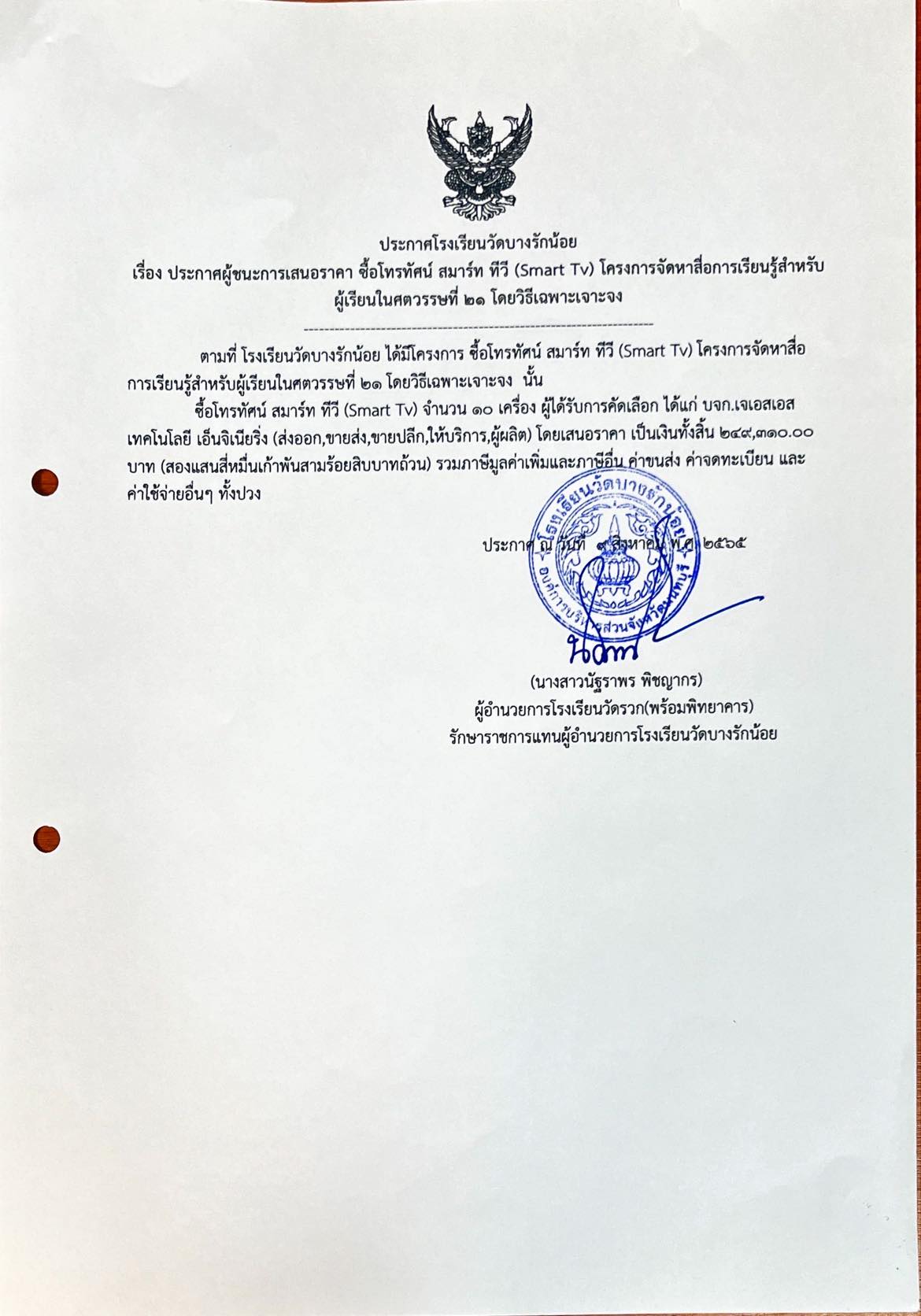 ประกาศผู้ชนะการเสนอราคา ซื้อโทรทัศน์ สมาร์ท ทีวี (Smart TV) โครงการจัดหาสื่อการเรียนรู้สำหรับผู้เรียนในศตวรรษที่ 21 โดยวิธีเฉพาะเจาะจง