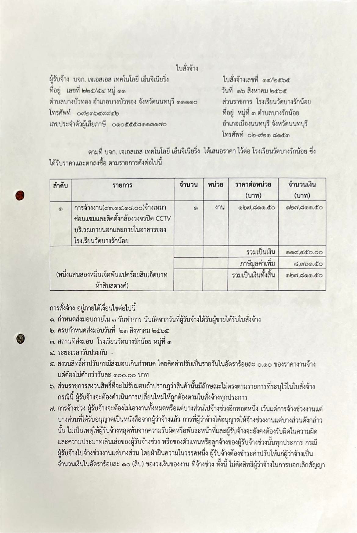 ใบสั่งจ้างเหมาซ่อมแซมและติดตั้งกล้องวงจรปิด CCTV โครงการปรับปรุงซ่อมแซมอาคารสถานที่และสาธารณูปโภค โดยวิธีเฉพาะเจาะจง