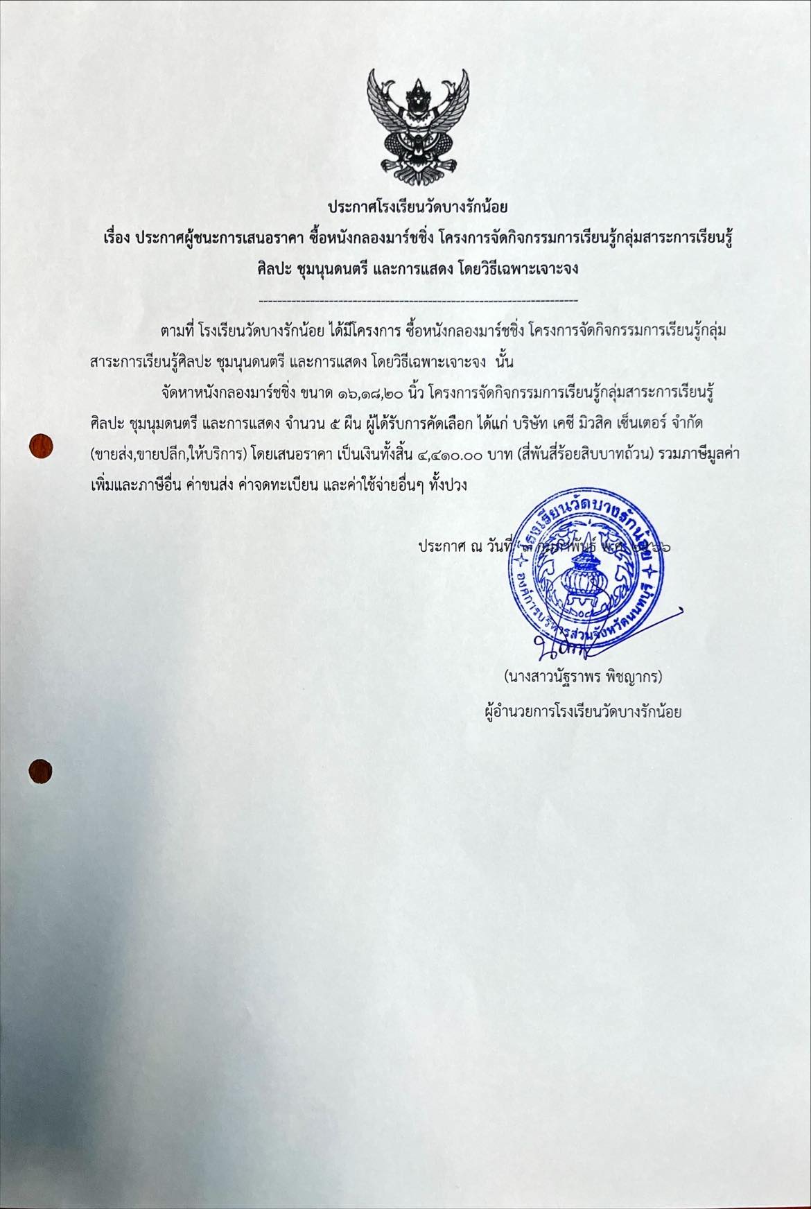 ประกาศผู้ชนะการเสนอราคา ซื้อหนังกลองมาร์ชชิ่ง โครงการจัดกิจกรรมการเรียนรู้กลุ่มสาระการเรียนรู้ศิลปะ ชุมนุมดนตรี และการแสดง โดยวิธีเฉพาะเจาะจง