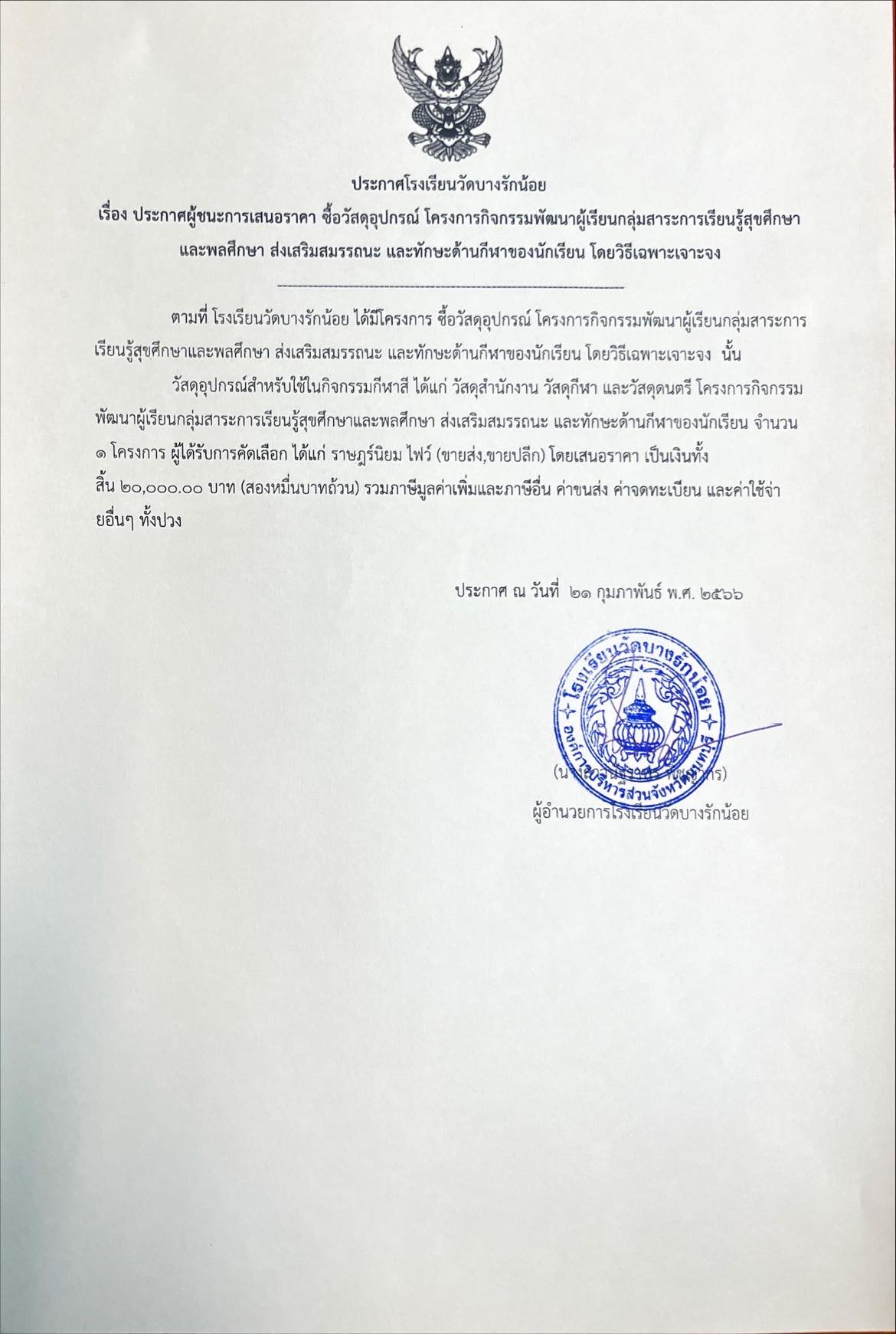 ประกาศผู้ชนะการเสนอราคา ซื้อวัสดุอุปกรณ์ โครงการกิจกรรมพัฒนาผู้เรียนกลุ่มสาระการเรียนรู้สุขศึกษาและพลศึกษา ส่งเสริมสมรรถนะ และทักษะด้านกีฬาของนักเรียน โดยวิธีเฉพาะเจาะจง