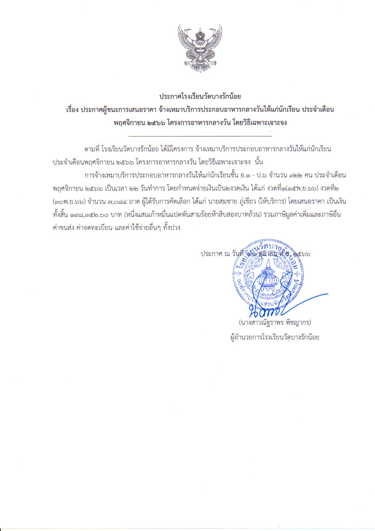 ประกาศผู้ชนะการเสนอราคา จ้างเหมาบริการประกอบอาหารกลางวันให้แก่เด็กนักเรียน ประจำเดือนพฤศจิกายน 2566 โครงการอาหารกลางวัน โดยวิธีเฉพาะเจาะจง ผู้ได้รับการคัดเลือกได้แก่ นายสมชาย ภู่เขียว โดยเสนอราคาเป็นเงินทั้งสิ้น 198,352.00 บาท (หนึ่งแสนเก้าหมื่นแปดพันสามร้อยห้าสิบสองบาทถ้วน) รวมภาษีมูลค่าเพิ่มและภาษีอื่น ๆ ค่าขนส่ง ค่าจดทะเบียน และค่าใช้จ่ายอื่น ๆ ทั้งปวง