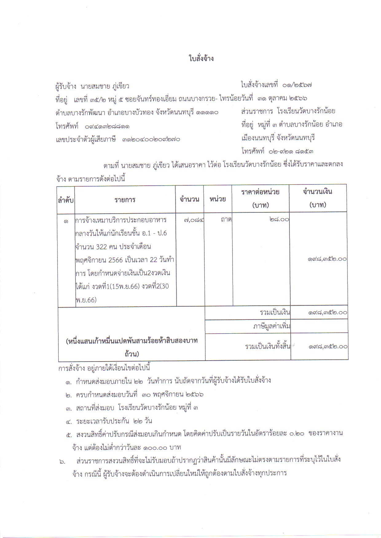| ใบสั่งจ้าง จ้างเหมาบริการประกอบอาหารกลางวันให้แก่เด็กนักเรียน ประจำเดือนพฤศจิกายน 2566 โครงการอาหารกลางวัน โดยวิธีเฉพาะเจาะจง โดยผู้ประกอบการ นายสมชาย ภู่เขียว โดยเสนอราคาเป็นเงินทั้งสิ้น 198,352.00 บาท (หนึ่งแสนเก้าหมื่นแปดพันสามร้อยห้าสิบสองบาทถ้วน) รวมภาษีมูลค่าเพิ่มและภาษีอื่น ๆ ค่าขนส่ง ค่าจดทะเบียน และค่าใช้จ่ายอื่น ๆ ทั้งปวง |